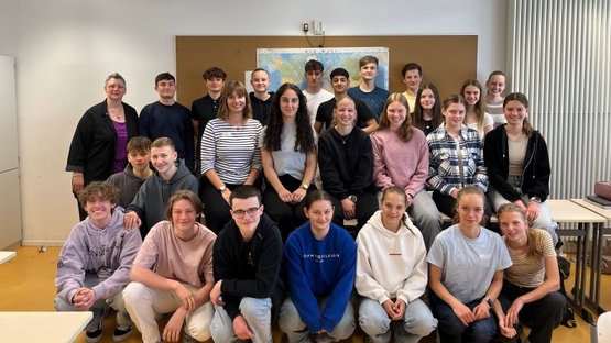 Eine Gruppe junger Menschen steht auf einer Wiese vor mehreren dunklen Steinkreuzen auf einem Friedhof. Die Szene spielt an einem bewölkten Tag, umgeben von grünen Bäumen und Büschen
